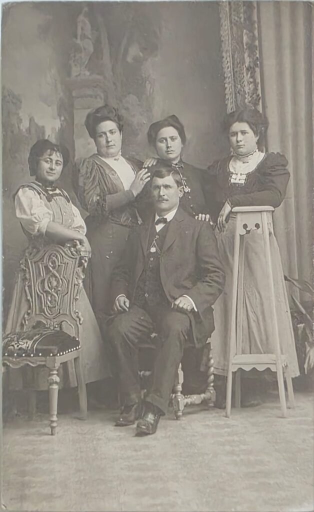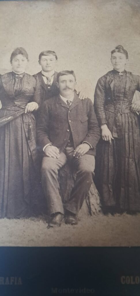 Retrato de estudio de cuatro personas: un hombre adulto sentado en el centro, flanqueado por tres personas jóvenes de pie (dos mujeres y un hombre). Las mujeres visten trajes largos oscuros de corte victoriano, una de ellas sostiene un abanico. El joven, con chaqueta y chaleco, aparece entre ellas. El grupo muestra una disposición simétrica, con la figura masculina adulta en el centro, posiblemente el padre. El suelo simula césped o alfombra texturada, y el fondo es neutro .