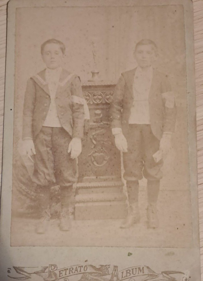 Justificación: el diseño tipográfico del reverso, las vestimentas (velos, guantes y vestidos blancos largos con encaje) y la utilización del formato gabinete coinciden con retratos de estudio de primeras comuniones de la primera década del siglo XX. El estudio Santini Hermanos se encontraba activo en Montevideo en ese período, coincidiendo con la expansión del retrato burgués.