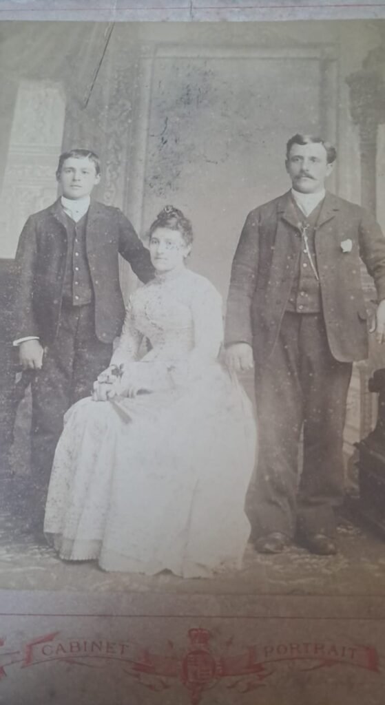 Retrato formal tomado en estudio, que muestra a tres personas posando ante un fondo decorado: una mujer joven sentada en el centro, con vestido largo claro, guantes, abanico y peinado recogido, acompañada por dos hombres vestidos con trajes oscuros. El hombre a la derecha, de bigote, aparenta mayor edad y se presume que es el padre; el joven a la izquierda podría ser el hermano.