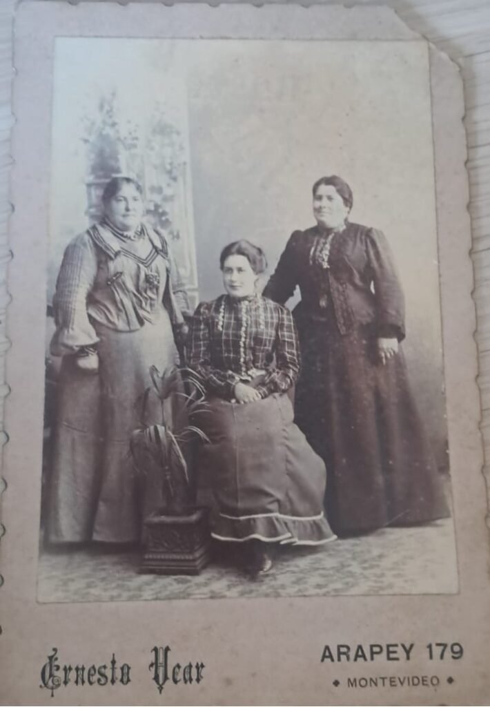 Retrato de tres mujeres adultas, posando en interior de estudio sobre una alfombra decorada. Una de ellas está sentada al centro, mientras que las otras dos se ubican de pie a los costados. El fondo representa una escena pictórica y se observa una planta ornamental en primer plano, lo que sugiere una puesta en escena cuidadosamente pensada. Las mujeres visten blusas ajustadas de manga larga y faldas amplias, con detalles de encaje, plisados y adornos que remiten a la moda urbana de fines del siglo XIX.