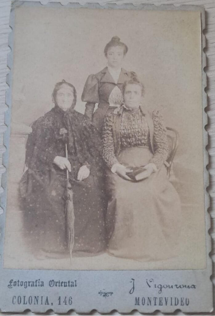 Descripción: Retrato de estudio que presenta a tres mujeres de distintas generaciones: dos sentadas al frente (una anciana vestida de negro con velo y sombrilla; otra adulta con vestido plisado y un libro en mano), y una joven de pie detrás de ellas. La mujer mayor sostiene una sombrilla cerrada y viste ropa negra con velo: puede interpretarse como señal de viudez o luto. La mujer sentada a la derecha porta un libro, lo que puede representar instrucción, religión o estatus cultural. La joven de pie lleva un vestido más estructurado con mangas abullonadas, característica típica de la moda de los años 1890s.