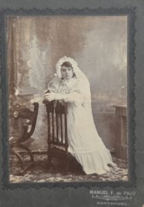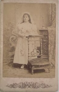 Justificación: la decoración del reverso, el uso de cartón beige con ornamentación impresa y la tipografía caligráfica corresponden a retratos de gabinete de transición entre la albúmina y las primeras copias en gelatina. El estudio Federico Brunel se encontraba activo en Montevideo en la última década del siglo XIX. La vestimenta —vestido blanco con encaje y la presencia del reclinatorio y cirio— corresponde a retratos de comunión típicos de ese período.