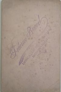 Justificación: el formato de gabinete con borde biselado y tipografía caligráfica en anverso, junto con el fondo pintado y los accesorios escenográficos (piedras artificiales, cesta de flores), es típico del período tardío de la albúmina en Uruguay. El fotógrafo Antonio Bixio figura activo en Montevideo hacia fines del siglo XIX.