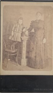Retrato de estudio de dos figuras femeninas: una mujer adulta de pie y una niña apoyada sobre una silla alta junto a una columna decorativa. La mujer viste traje oscuro de cuerpo rígido, con cuello cerrado y cintura ajustada, mientras la niña lleva un vestido claro a rayas verticales con moño en el cabello. Ambas miran al frente, en actitud serena y formal. El fondo pintado sugiere un interior con cortinados y mobiliario de fantasía, típico de los estudios fotográficos de la época.