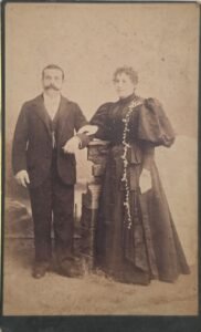 Retrato formal de estudio de una pareja de pie. El hombre, a la izquierda, viste un traje de tres piezas y apoya su brazo derecho sobre una columna decorativa de madera o yeso. La mujer, a la derecha, luce un vestido largo oscuro con corsé ajustado y mangas estructuradas. Ambos mantienen expresiones serias y están ubicados en un fondo pintado que representa un paisaje boscoso.