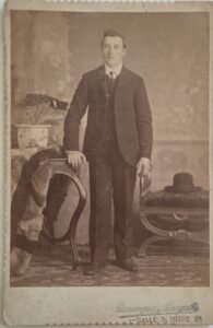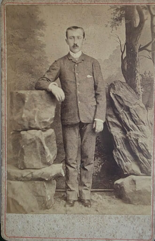 Justificación: el formato del cartón, la vestimenta (traje abotonado, cuello alto con lazo o corbata corta) y la escenografía naturalista son típicos de retratos masculinos de ese período. También el peinado y bigote fino corresponden a la moda decimonónica tardía.