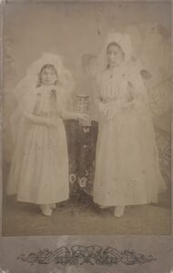 Retrato de dos niñas jóvenes de pie, con vestidos blancos largos de ceremonia, velos y guantes, tomadas en un estudio fotográfico. Ambas se ubican a los costados de una mesa o pedestal cubierto con paño oscuro sobre el que se apoya un objeto decorativo (posiblemente un copón o libro religioso). El fondo es neutro con elementos florales pintados.