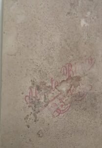 - Reverso: sello en tinta violeta con caligrafía ornamental: