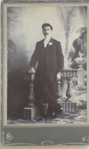 Retrato de cuerpo entero de un hombre joven de pie, apoyado con el brazo izquierdo sobre una balaustrada de estudio. Viste traje oscuro con chaleco, camisa blanca y flor en la solapa, indicando posible retrato de boda o de compromiso. Fondo pictórico con arquitectura clásica, balaustradas y vegetación estilizada, de moda en estudios fotográficos de comienzos del siglo XX.